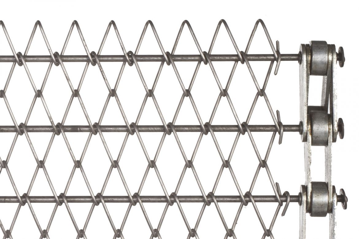 Loose mesh belts with looped edges, interlocked spirals, composed of alternate left and right woven sections. The alternate winding provides a straight smooth sliding, available also mounted on hollow bolt roller chain. The ends of cross members are welded.