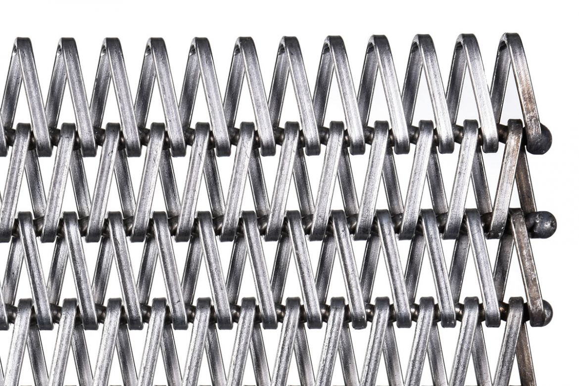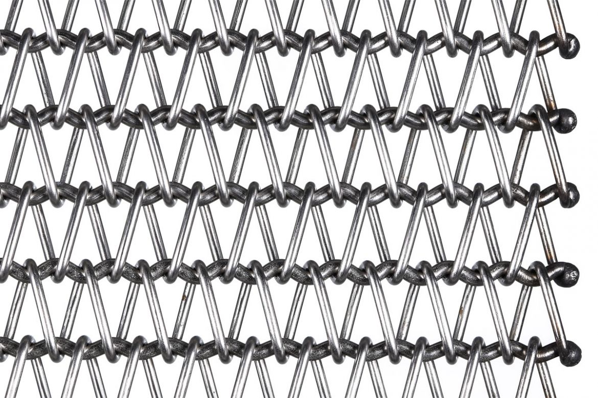 Wire link belt with welded edges, flat and round wire spirals, woven alternately left and right.