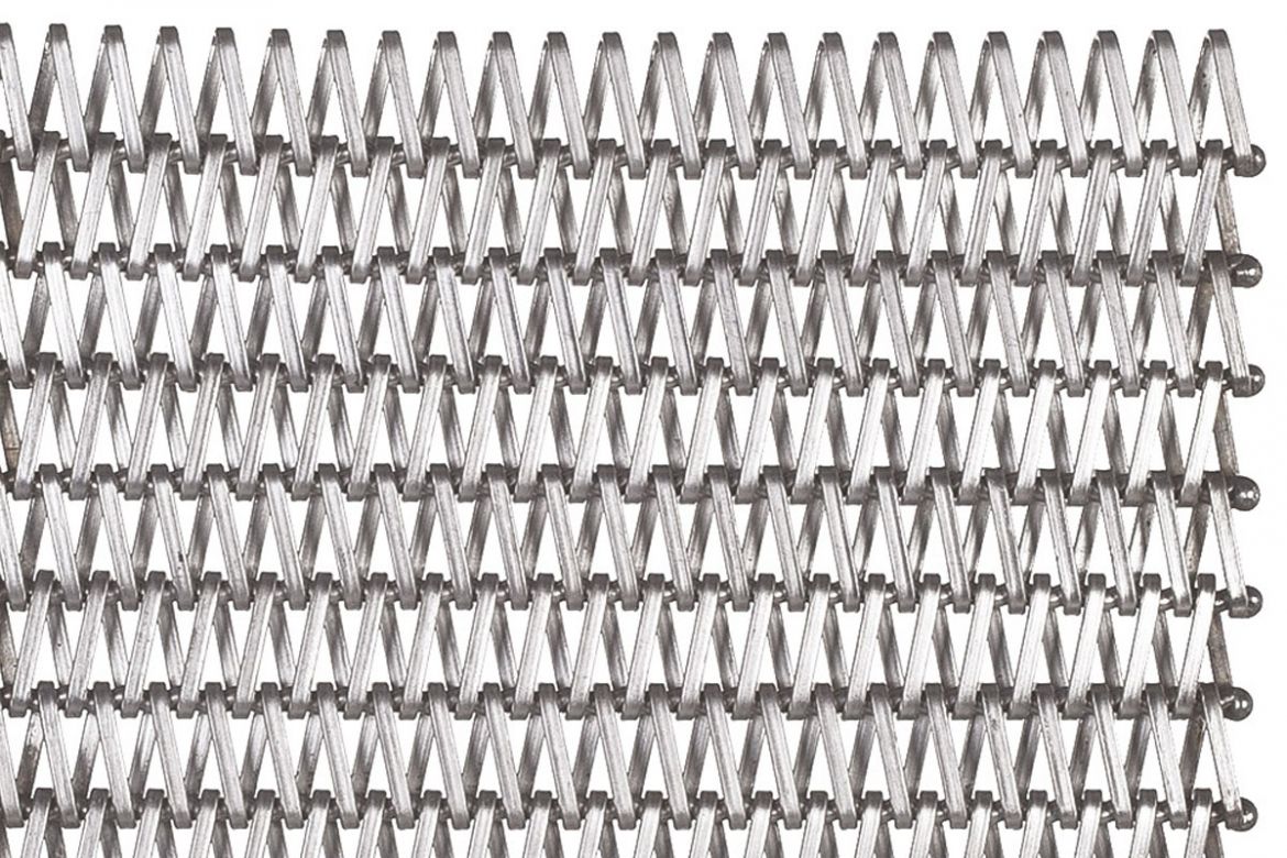 Wire link belt with welded edges, flat and round wire spirals, woven alternately left and right.